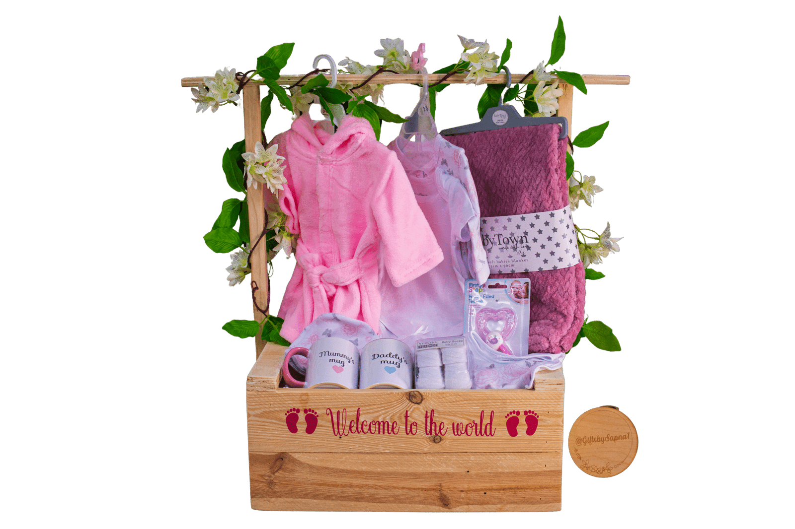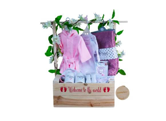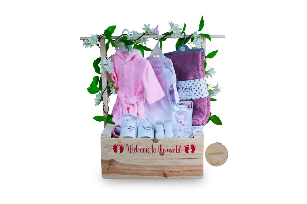 Celebrate new beginnings with a complete newborn and parents’ hamper, including clothing, a soft blanket, teether, and “Mummy & Daddy” mugs.