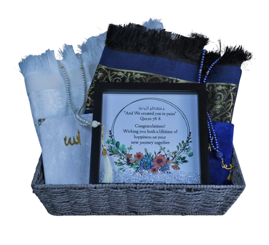 Celebrate love and faith with this thoughtfully curated Mr. & Mrs. hamper, featuring prayer mats, tasbeehs, Surah books, and a wedding frame.