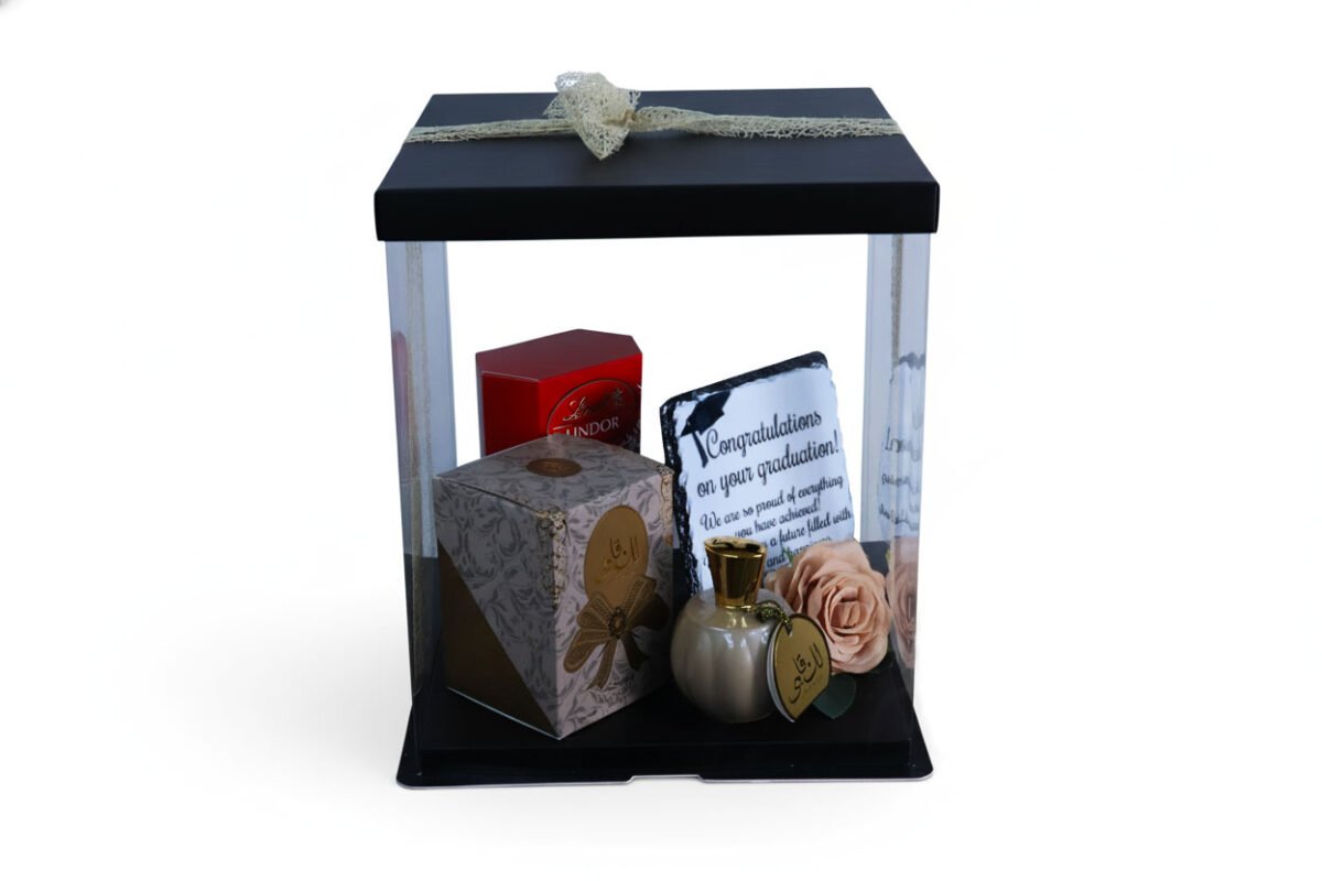 Mark this milestone with a gift that combines style, elegance, and sweetness. This graduation gift box includes a slate to remember their achievement, a perfume, and Lindt chocolate - a keepsake to cherish. It comes in a stunning gift box, complete with decorative flowers and a ribbon.