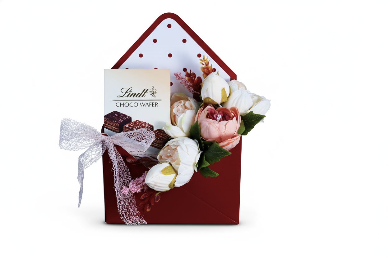 Send love in the sweetest way with this elegant envelope-style gift box, featuring beautifully arranged artificial flowers paired with delicious Lindt chocolates. Ideal for any occasion