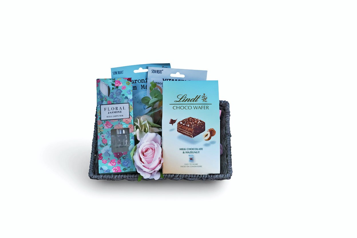 Spoil your loved ones with this lovely hamper, filled with a nourishing face masks a floral diffuser, Lindt chocolates, and artificial flowers. An ideal gift for birthdays, anniversaries, or any special occasion.