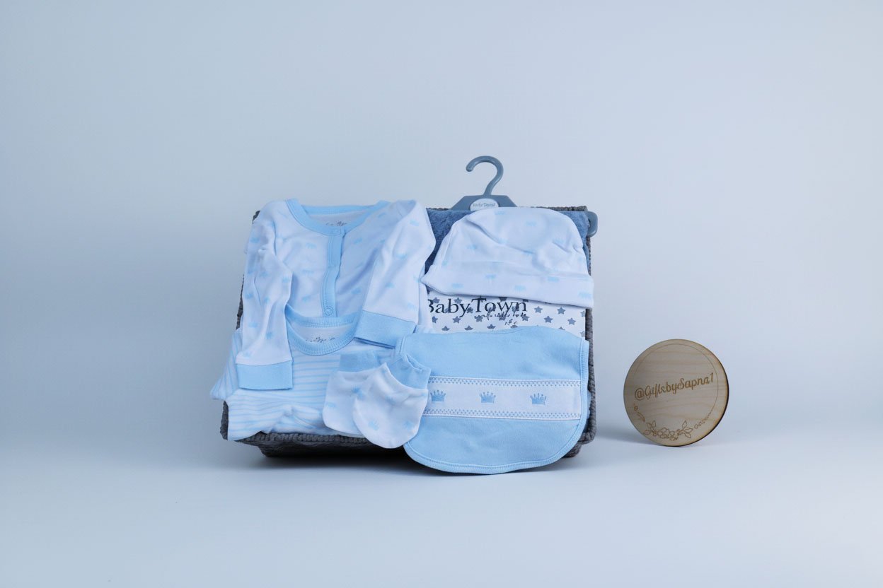 This newborn baby hamper includes a cosy baby grow, vest, hat, mittens, bib, and ultra-soft blanket — all essentials for a baby’s first days. Perfect as a baby shower gift or newborn present from Gifts by Sapna.