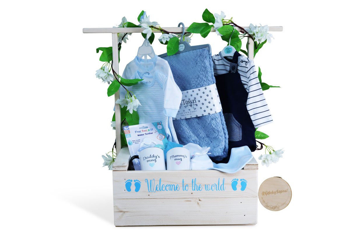 Celebrate new beginnings with this complete newborn and parents’ gift hamper featuring a baby grow, vest, hat, mittens, bib, super-soft blanket, teether, and baby socks.