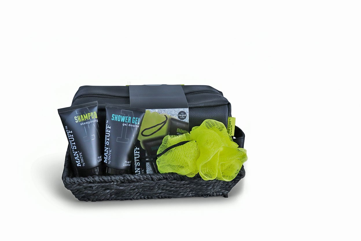 This men’s hamper includes shower gel, shampoo, a shower net sponge and a compact small bag, neatly packaged for convenience and style. Perfect for travel or everyday use.