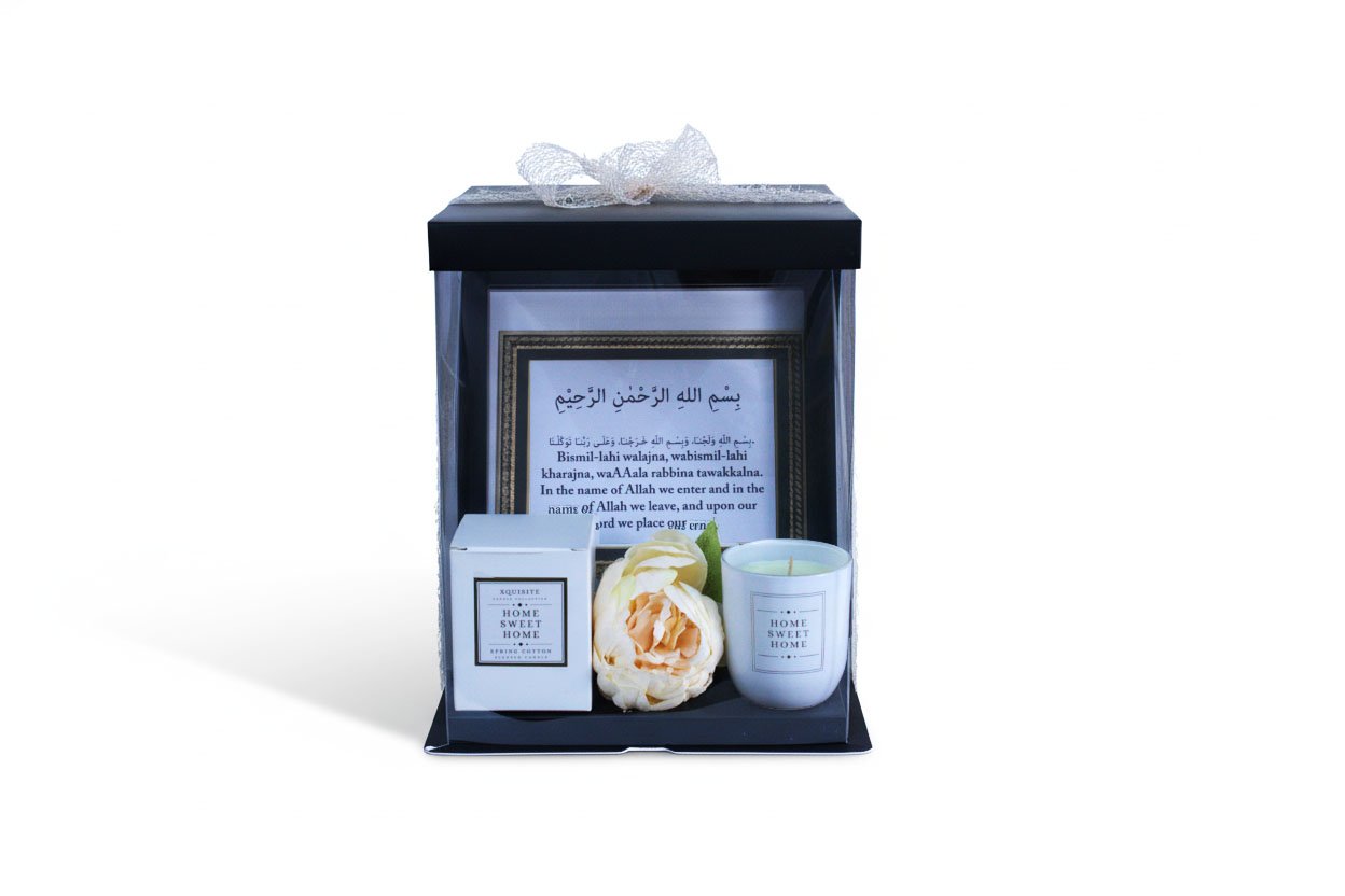 Celebrate a new beginning with this Islamic home frame and candle set. The frame adds a touch of faith and elegance to any space. The frame includes the dua upon entering your home, while the candle brings warmth and serenity, making it a thoughtful gift for a new home. It comes in a stunning gift box, complete with decorative flowers and a ribbon.