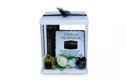 Umrah Mubarak gift set, featuring an Umrah Mubarak slate, the Kaaba Kiswah scent diffuser and a beautiful tasbeeh set with flowers. Perfect for gifting, it’s a thoughtful keepsake to honour someone embarking on their spiritual journey, which gains rewards for you and them.