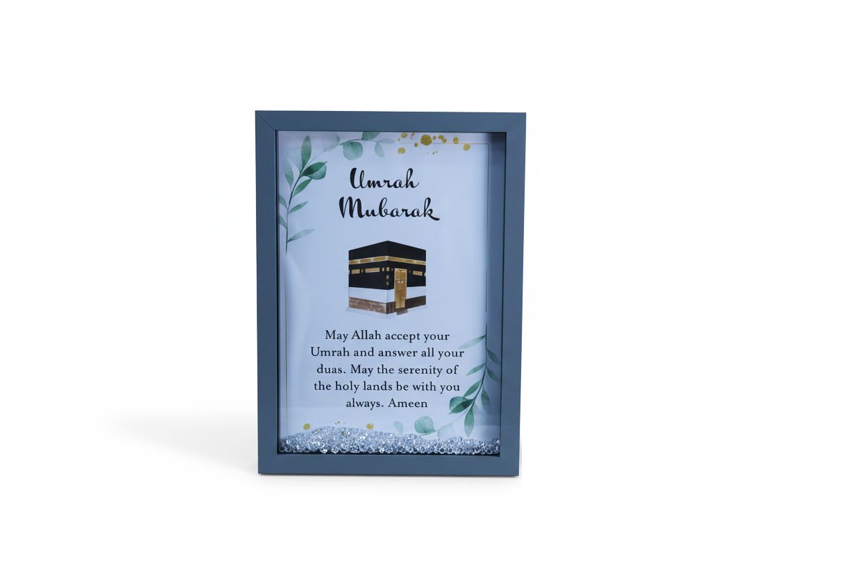 A beautifully crafted Umrah Mubarak keepsake frame designed to preserve the cherished memories of a sacred journey.