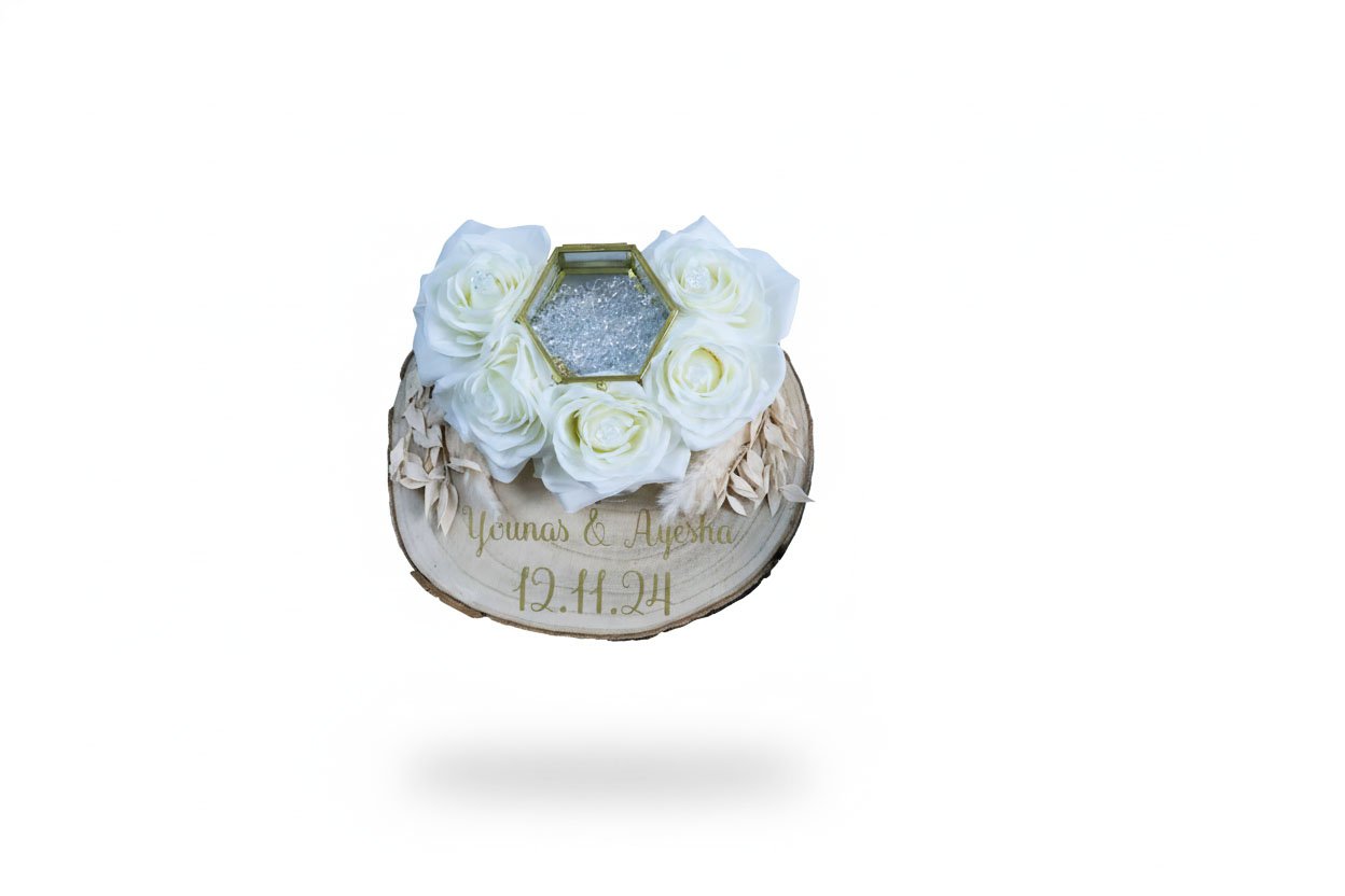 Celebrate your special day with this charming wooden log wedding ring tray. Perfect for exchanging rings, it blends functionality with timeless elegance